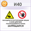 Знак «Находиться посторонним лицам в зоне действия грузоподъемного крана запрещается», И40 (металл, 600х400 мм)