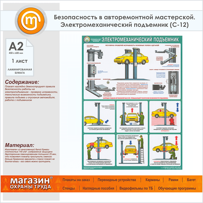 Плакат «Безопасность в авторемонтной мастерской. Электромеханический подъемник» (С-12, ламинированная бумага, А2, 1 лист) в Томске купить