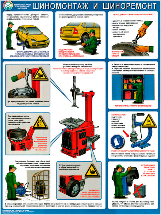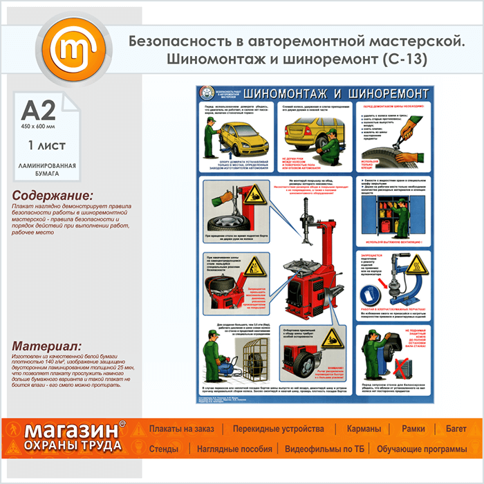 Плакат «Безопасность в авторемонтной мастерской. Шиномонтаж и шиноремонт» (С-13, ламинированная бумага, А2, 1 лист) в Томске купить