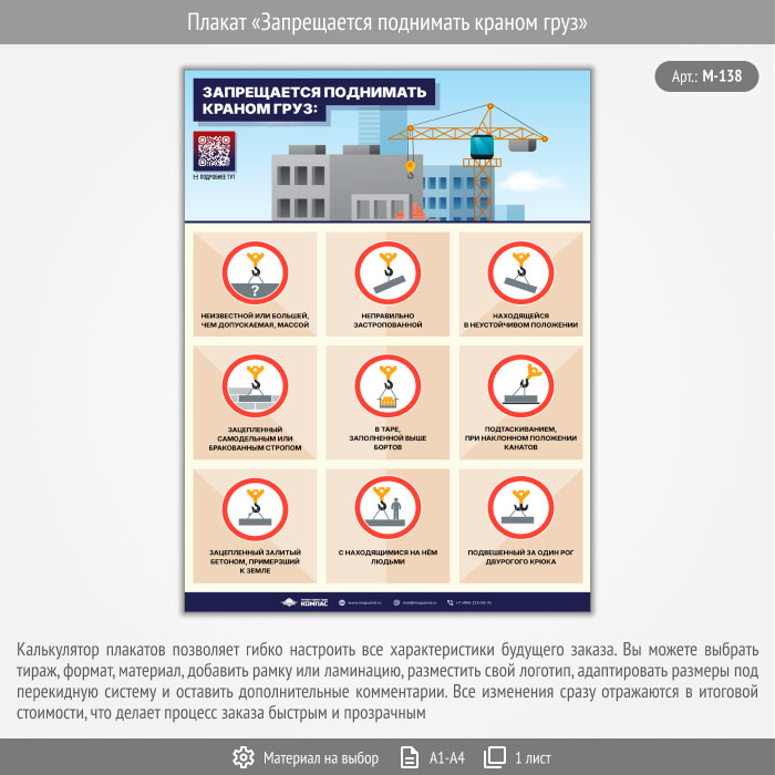 Плакат «Запрещается поднимать краном груз» с QR (М-138, 1 лист) в Томске купить