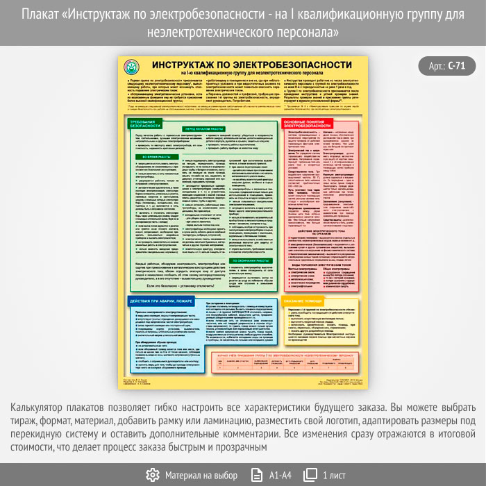 Плакат «Инструктаж по электробезопасности - на I квалификационную группу для неэлектротехнического персонала» (С-71, 1 лист) в Томске купить