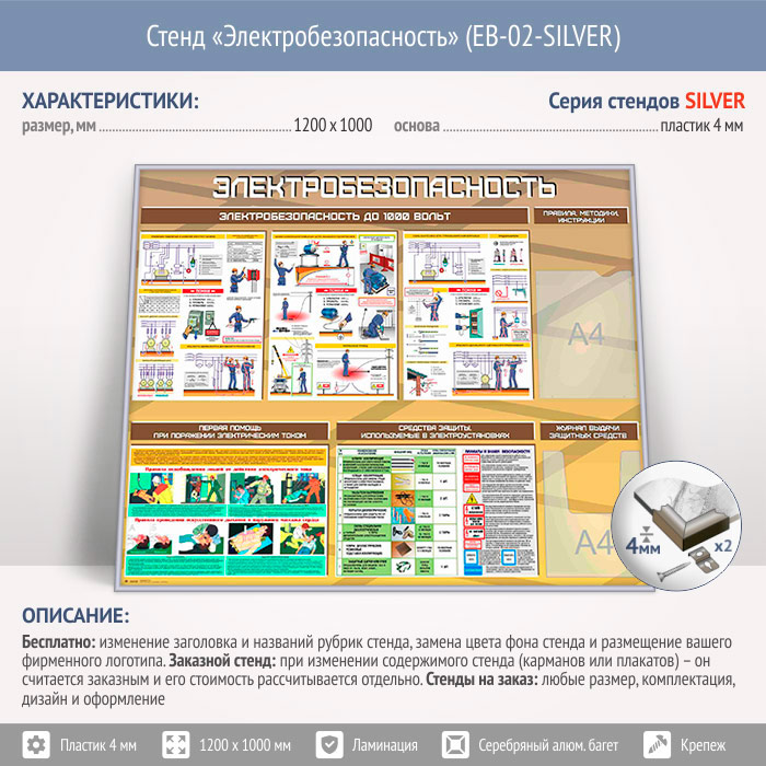 Стенд «Электробезопасность до 1000 вольт» с плоским и объемным карманами (EB-02-SILVER) в Томске купить