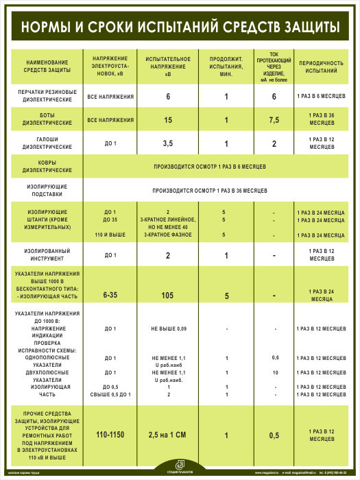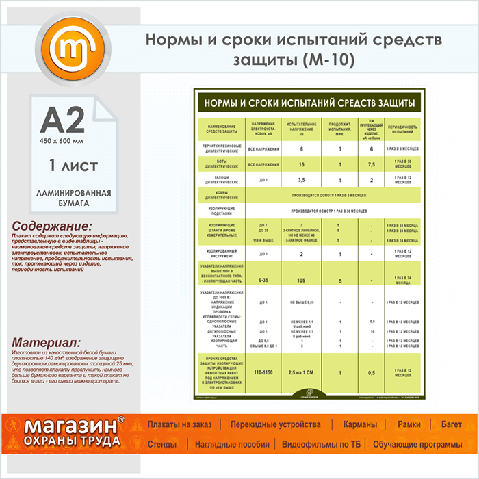 Плакат «Нормы и сроки испытаний средств защиты» (М-10, ламинированная бумага, А2, 1 лист) в Томске купить
