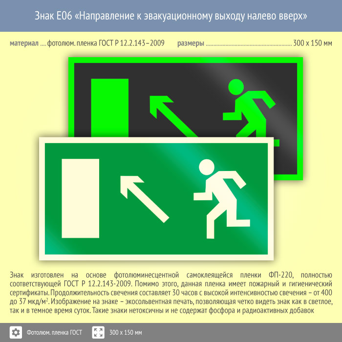 Знак E06 «Направление к эвакуационному выходу налево вверх» (фотолюминесцентная пленка ГОСТ 34428-2018, 300х150 мм) в Томске купить