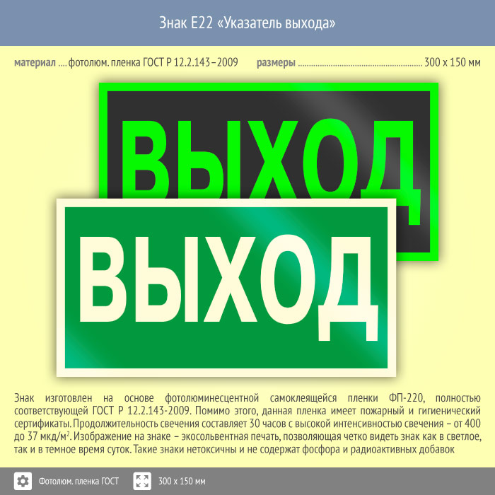 Знак E22 «Указатель выхода» (фотолюминесцентная пленка ГОСТ 34428-2018, 300х150 мм) в Томске купить