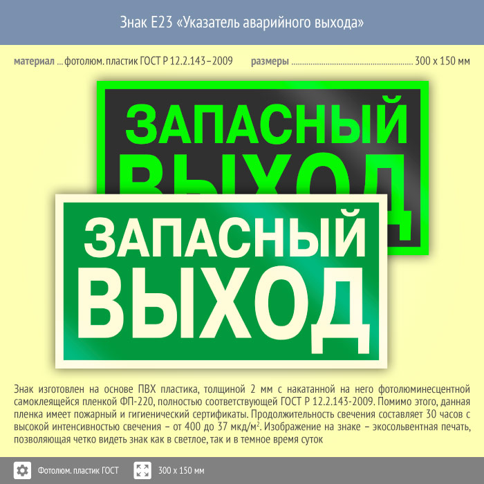 Знак E23 «Указатель запасного выхода» (устаревший) (фотолюминесцентный пластик ГОСТ 34428-2018, 300х150 мм) в Томске купить