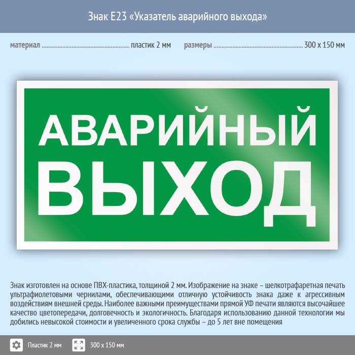Знак E23 «Указатель аварийного выхода» (пластик, 300х150 мм) в Томске купить