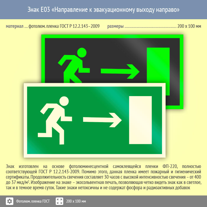 Знак E03 «Направление к эвакуационному выходу направо» (фотолюминесцентная пленка ГОСТ 34428-2018, 200х100 мм) в Томске купить