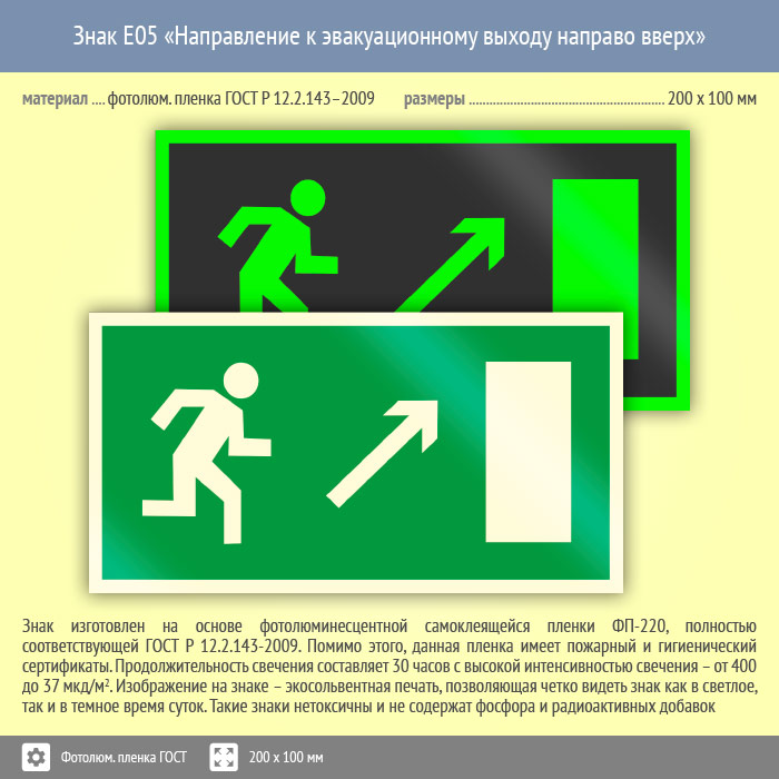 Знак E05 «Направление к эвакуационному выходу направо вверх» (фотолюминесцентная пленка ГОСТ 34428-2018, 200х100 мм) в Томске купить