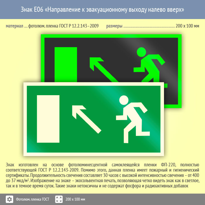 Знак E06 «Направление к эвакуационному выходу налево вверх» (фотолюминесцентная пленка ГОСТ 34428-2018, 200х100 мм) в Томске купить