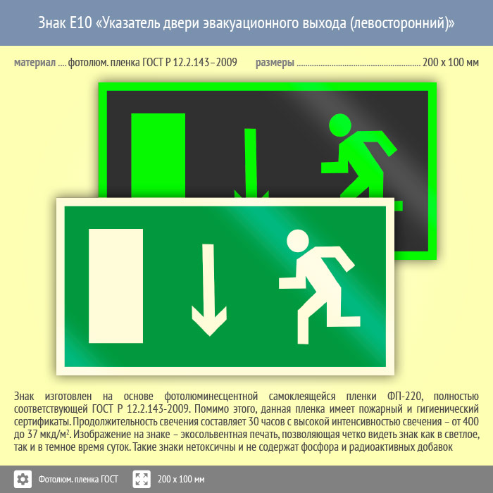 Знак E10 «Указатель двери эвакуационного выхода (левосторонний)» (фотолюминесцентная пленка ГОСТ 34428-2018, 200х100 мм) в Томске купить