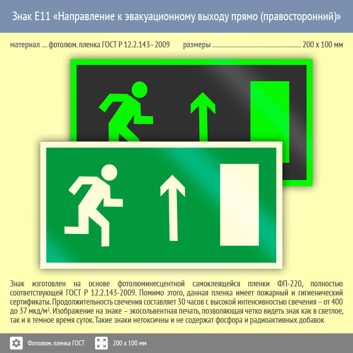 Знак E11 «Направление к эвакуационному выходу прямо (правосторонний)» (фотолюминесцентная пленка ГОСТ 34428-2018, 200х100 мм) в Томске купить