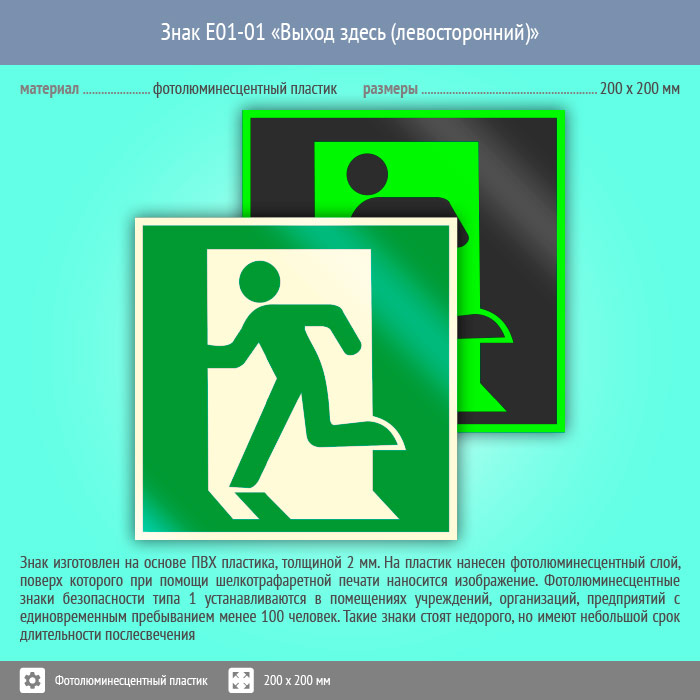 Знак E01-01 «Выход здесь (левосторонний)» (фотолюминесцентный пластик, 200х200 мм) в Томске купить