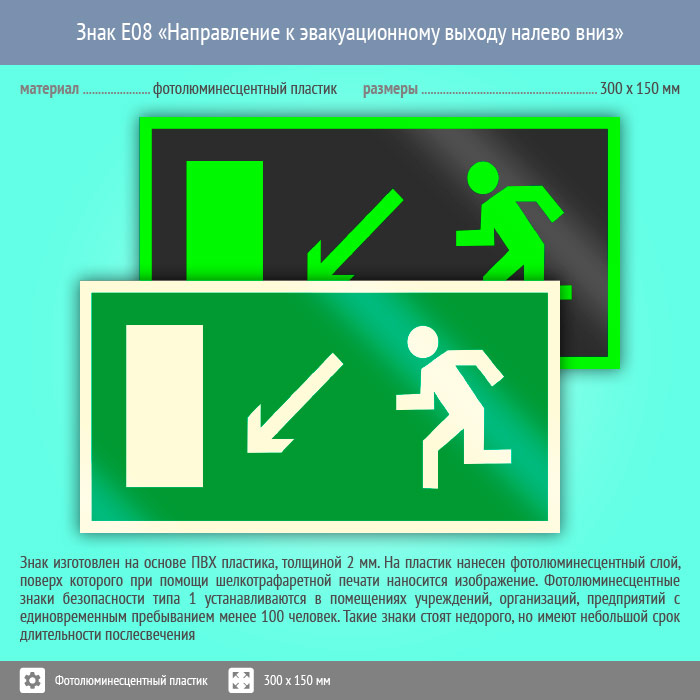 Знак E08 «Направление к эвакуационному выходу налево вниз» (фотолюминесцентный пластик, 300х150 мм) в Томске купить