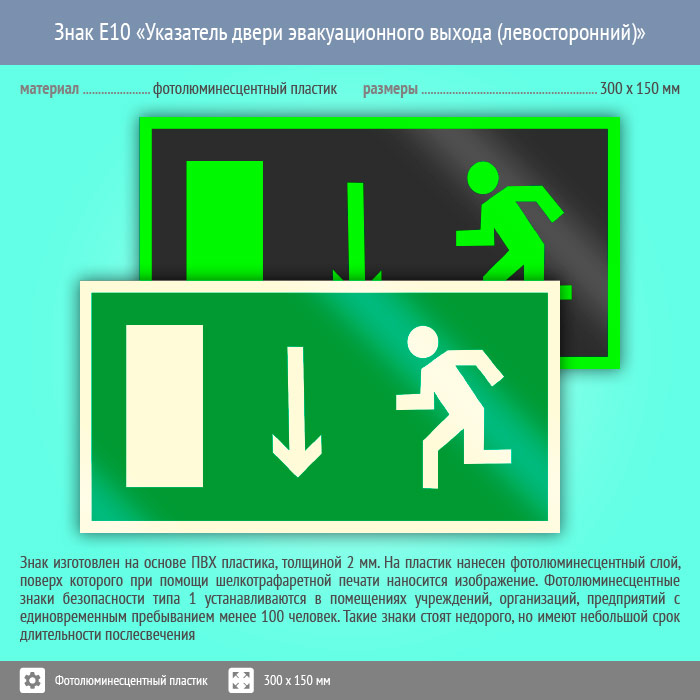 Знак E10 «Указатель двери эвакуационного выхода (левосторонний)» (фотолюминесцентный пластик, 300х150 мм) в Томске купить