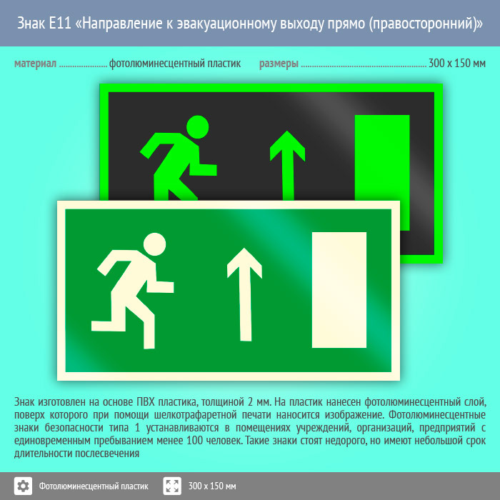 Знак E11 «Направление к эвакуационному выходу прямо (правосторонний)» (фотолюминесцентный пластик, 300х150 мм) в Томске купить