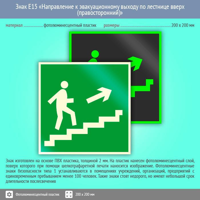 Знак E15 «Направление к эвакуационному выходу по лестнице вверх (правосторонний)» (фотолюминесцентный пластик, 200х200 мм) в Томске купить