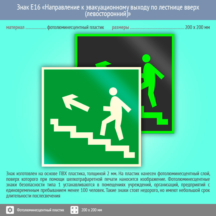 Знак E16 «Направление к эвакуационному выходу по лестнице вверх (левосторонний)» (фотолюминесцентный пластик, 200х200 мм) в Томске купить