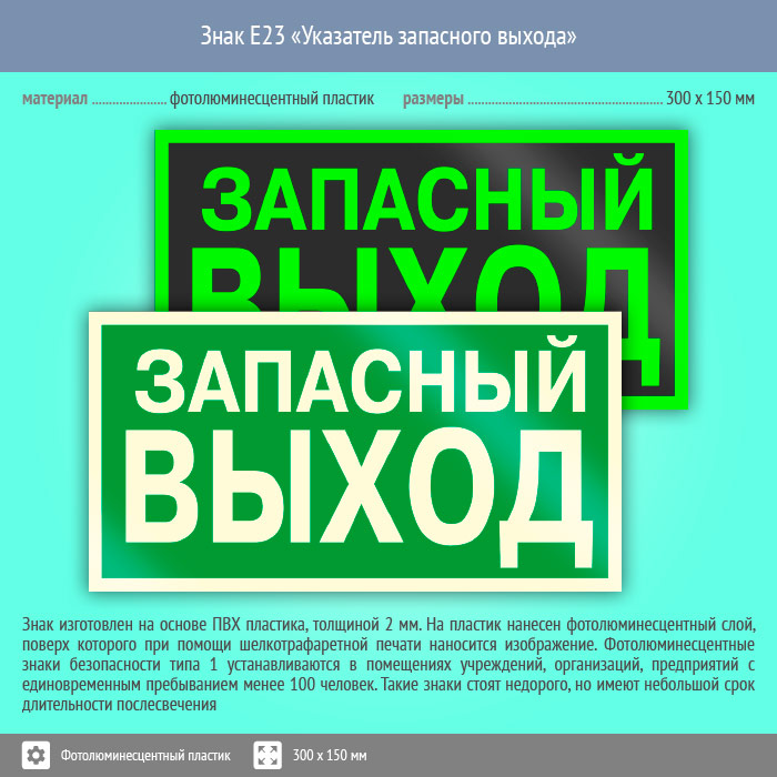 Знак E23 «Указатель запасного выхода» (устаревший) (фотолюминесцентный пластик, 300х150 мм) в Томске купить