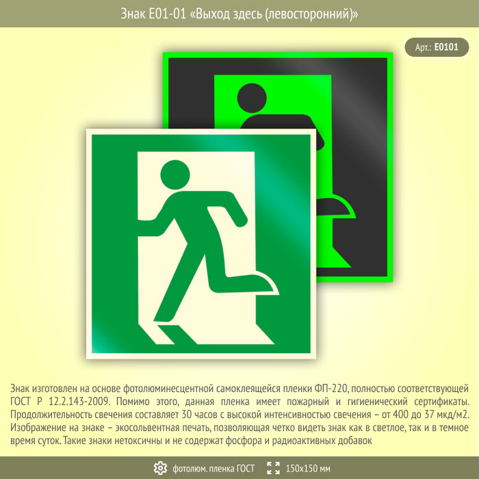 Знак E01-01 «Выход здесь (левосторонний)» (фотолюминесцентная пленка ГОСТ 34428-2018, 150х150 мм) в Томске купить