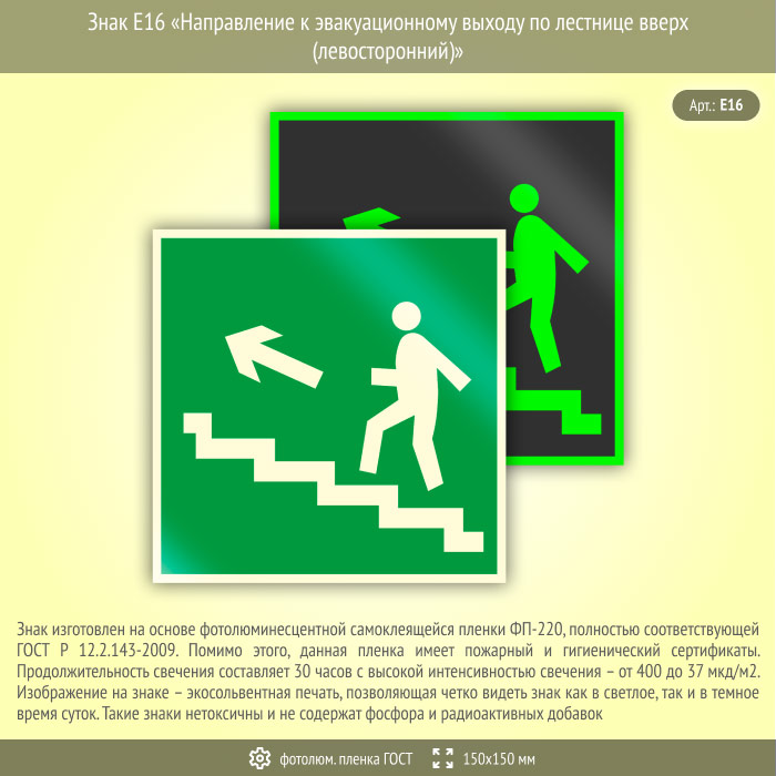 Знак E16 «Направление к эвакуационному выходу по лестнице вверх (левосторонний)» (фотолюминесцентная пленка ГОСТ 34428-2018, 150х150 мм) в Томске купить