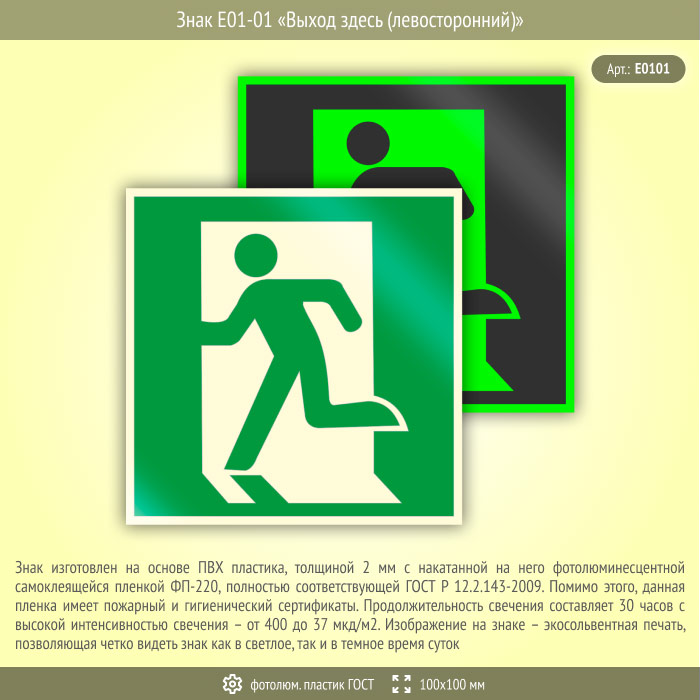 Знак E01-01 «Выход здесь (левосторонний)» (фотолюминесцентный пластик ГОСТ 34428-2018, 100х100 мм) в Томске купить