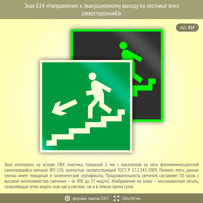 Знак E14 «Направление к эвакуационному выходу по лестнице вниз (левосторонний)» (фотолюминесцентный пластик ГОСТ 34428-2018, 100х100 мм) в Томске купить
