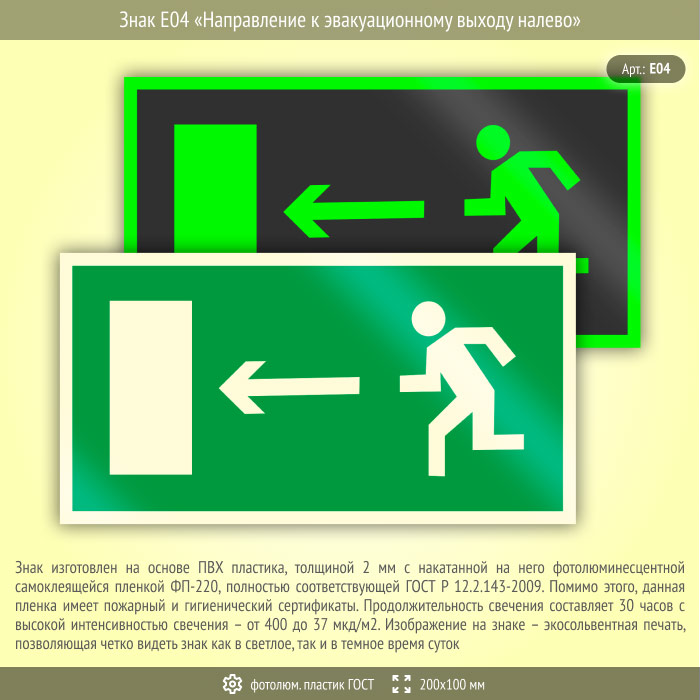 Знак E04 «Направление к эвакуационному выходу налево» (фотолюминесцентный пластик ГОСТ 34428-2018, 200х100 мм) в Томске купить