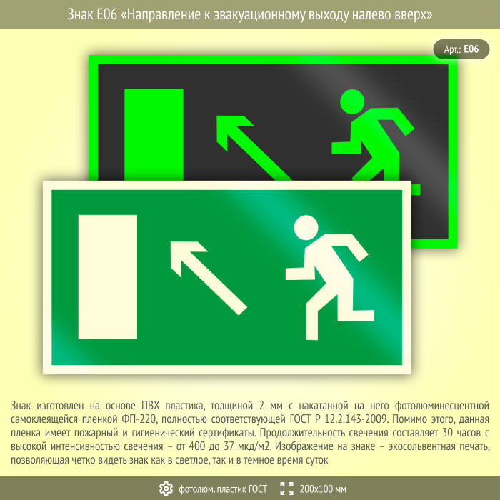 Знак E06 «Направление к эвакуационному выходу налево вверх» (фотолюминесцентный пластик ГОСТ 34428-2018, 200х100 мм) в Томске купить