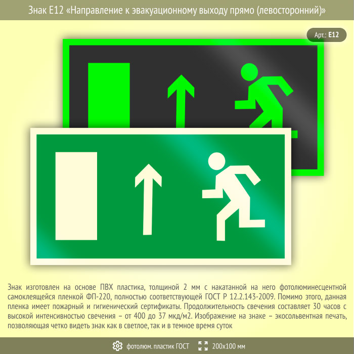 Знак E12 «Направление к эвакуационному выходу прямо (левосторонний)» (фотолюминесцентный пластик ГОСТ 34428-2018, 200х100 мм) в Томске купить