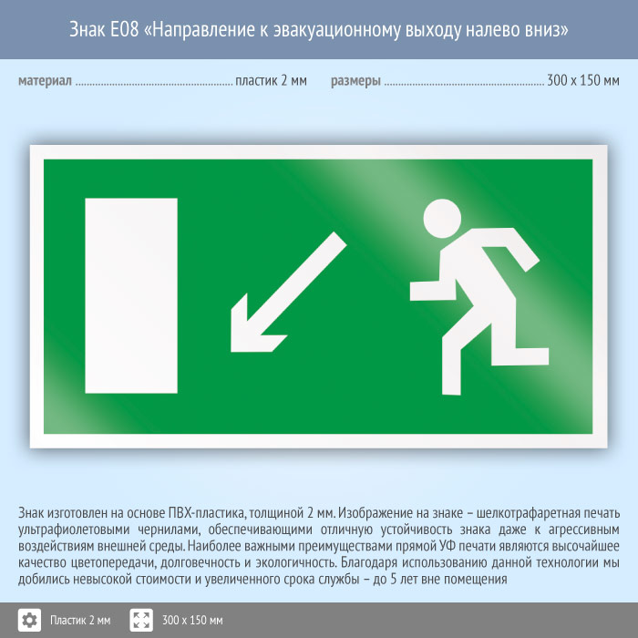Знак E08 «Направление к эвакуационному выходу налево вниз» (пластик, 300х150 мм) в Томске купить