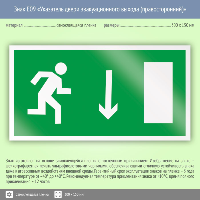 Знак E09 «Указатель двери эвакуационного выхода (правосторонний)» (пленка, 300х150 мм) в Томске купить
