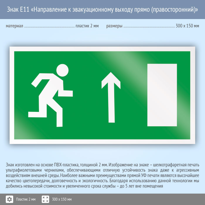 Знак E11 «Направление к эвакуационному выходу прямо (правосторонний)» (пластик, 300х150 мм) в Томске купить