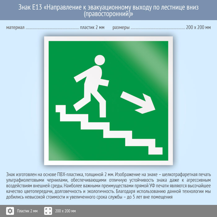Знак E13 «Направление к эвакуационному выходу по лестнице вниз (правосторонний)» (пластик, 200х200 мм) в Томске купить