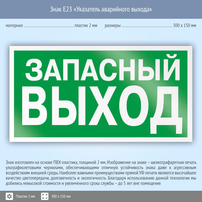 Знак E23 «Указатель запасного выхода» (устаревший) (пластик, 300х150 мм) в Томске купить