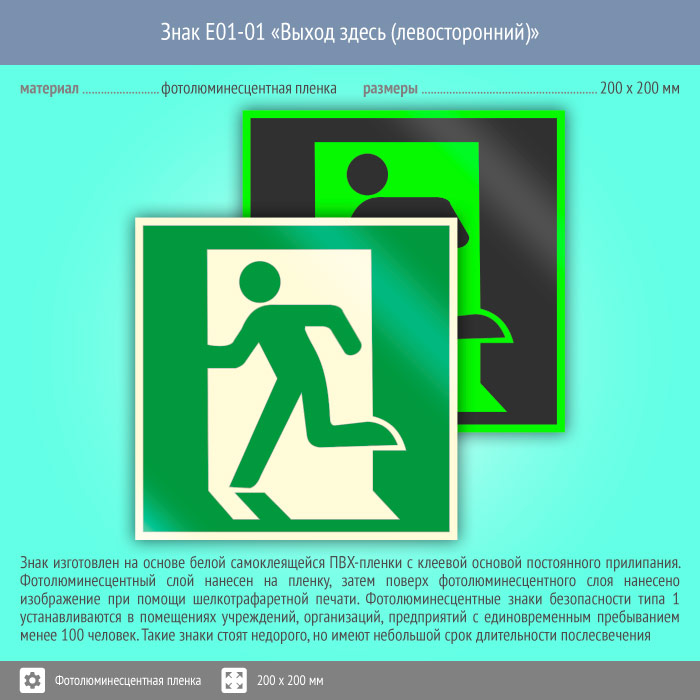 Знак E01-01 «Выход здесь (левосторонний)» (фотолюминесцентная пленка, 200х200 мм) в Томске купить