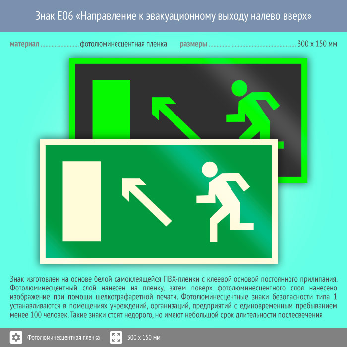 Знак E06 «Направление к эвакуационному выходу налево вверх» (фотолюминесцентная пленка, 300х150 мм) в Томске купить
