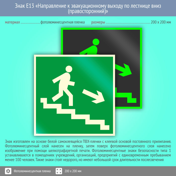 Знак E13 «Направление к эвакуационному выходу по лестнице вниз (правосторонний)» (фотолюминесцентная пленка, 200х200 мм) в Томске купить