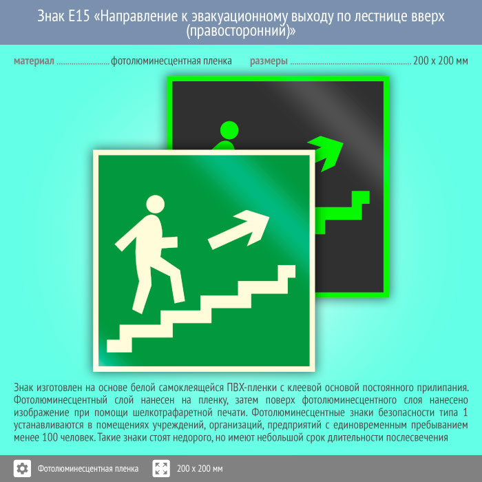 Знак E15 «Направление к эвакуационному выходу по лестнице вверх (правосторонний)» (фотолюминесцентная пленка, 200х200 мм) в Томске купить