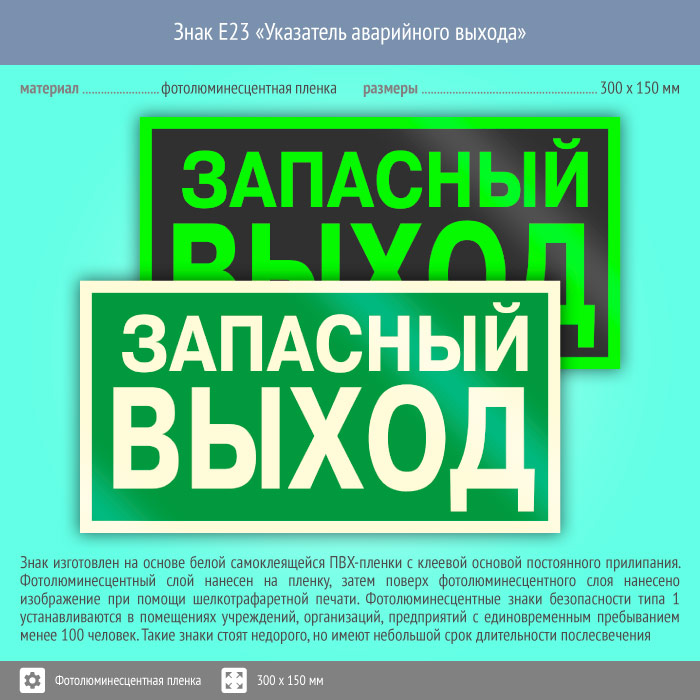 Знак E23 «Указатель запасного выхода» (устаревший) (фотолюминесцентная пленка, 300х150 мм) в Томске купить