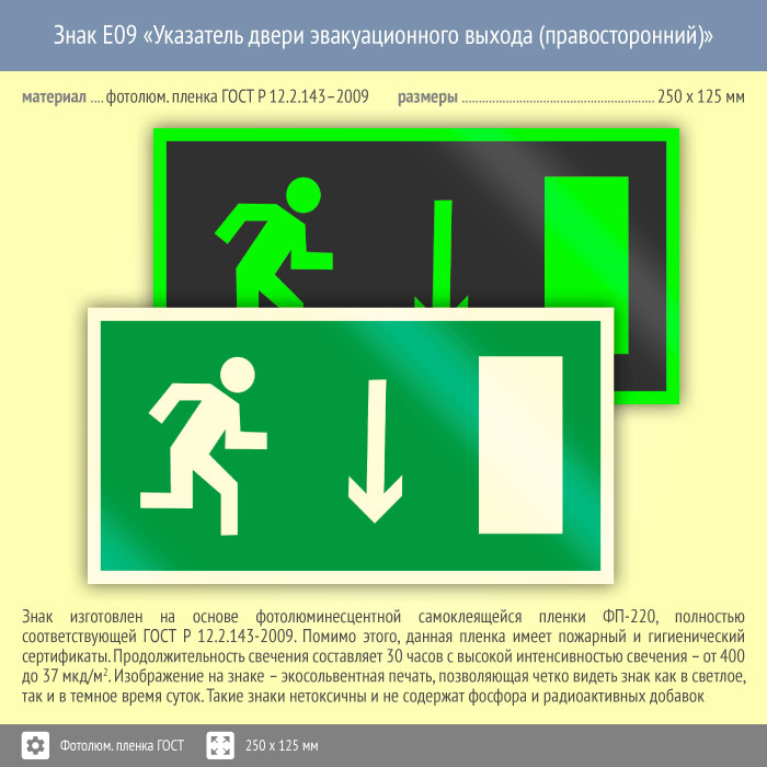 Знак E09 «Указатель двери эвакуационного выхода (правосторонний)» (фотолюминесцентная пленка ГОСТ 34428-2018, 250х125 мм) в Томске купить