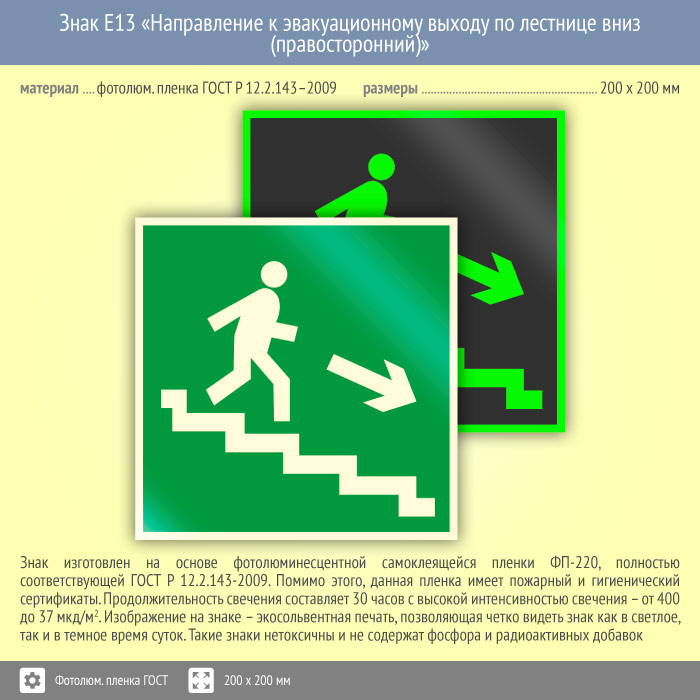 Знак E13 «Направление к эвакуационному выходу по лестнице вниз (правосторонний)» (фотолюминесцентная пленка ГОСТ 34428-2018, 200х200 мм) в Томске купить