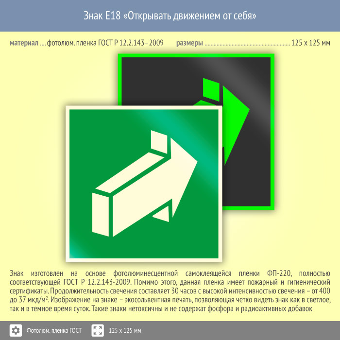 Знак E18 «Открывать движением от себя» (фотолюминесцентная пленка ГОСТ 34428-2018, 125х125 мм) в Томске купить