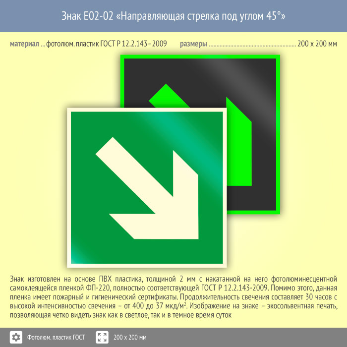 Знак E02-02 «Направляющая стрелка под углом 45°» (фотолюминесцентный пластик ГОСТ 34428-2018, 200х200 мм) в Томске купить