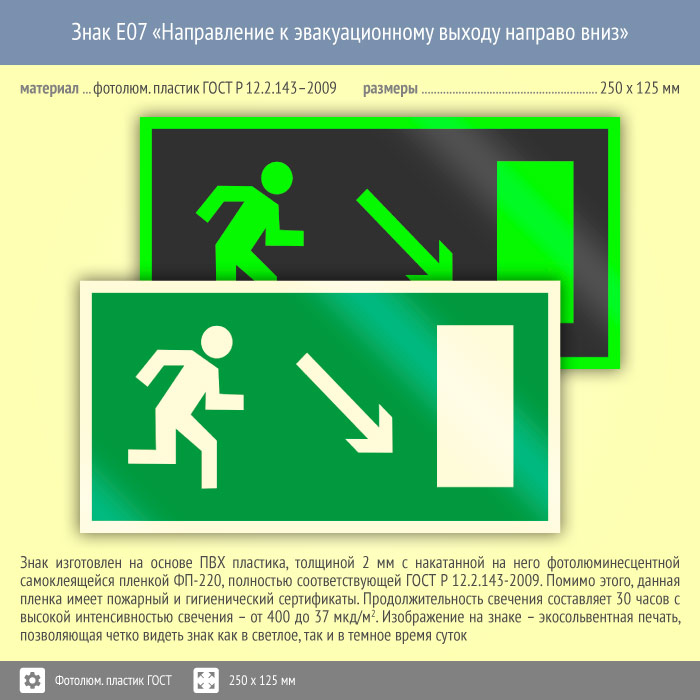 Знак E07 «Направление к эвакуационному выходу направо вниз» (фотолюминесцентный пластик ГОСТ 34428-2018, 250х125 мм) в Томске купить
