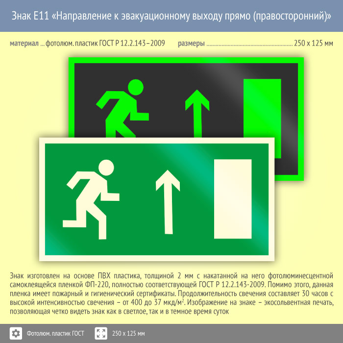 Знак E11 «Направление к эвакуационному выходу прямо (правосторонний)» (фотолюминесцентный пластик ГОСТ 34428-2018, 250х125 мм) в Томске купить
