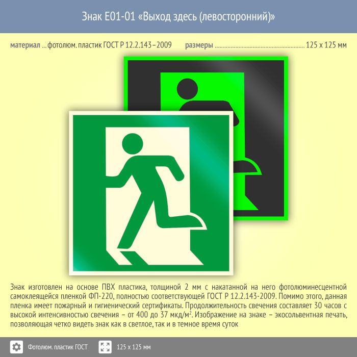 Знак E01-01 «Выход здесь (левосторонний)» (фотолюминесцентный пластик ГОСТ 34428-2018, 125х125 мм) в Томске купить