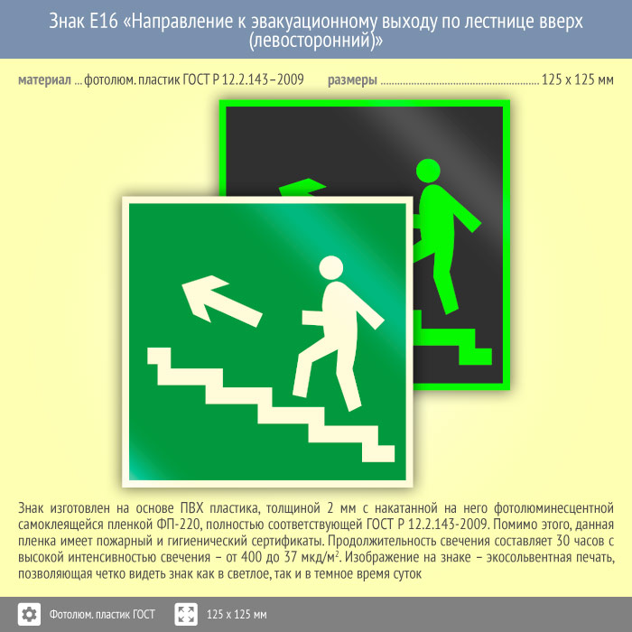 Знак E16 «Направление к эвакуационному выходу по лестнице вверх (левосторонний)» (фотолюминесцентный пластик ГОСТ 34428-2018, 125х125 мм) в Томске купить
