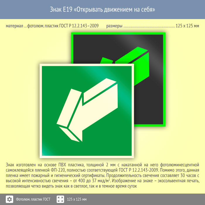 Знак E19 «Открывать движением на себя» (фотолюминесцентный пластик ГОСТ 34428-2018, 125х125 мм) в Томске купить