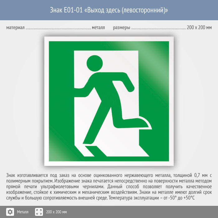 Знак E01-01 «Выход здесь (левосторонний)» (металл, 200х200 мм) в Томске купить